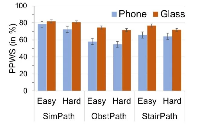Although there was no significant difference between ObstPath and StairPath in terms of participants’ average performance measures, the glass outperformed the phone on ObstPath but not on StairPath.